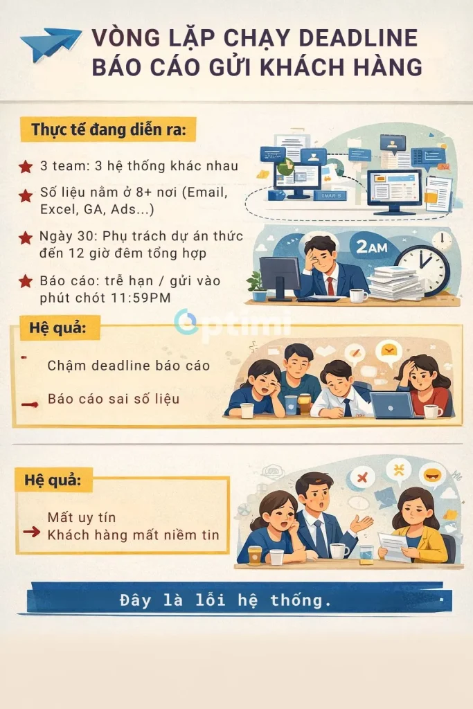 Tình huống giả định này không nhằm kể một câu chuyện hoàn hảo, mà để trả lời câu hỏi quan trọng nhất ở giai đoạn này: liệu việc chấm dứt chạy deadline báo cáo có thực sự khả thi với một agency quy mô vừa – hay chỉ là lý thuyết?