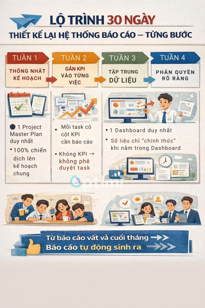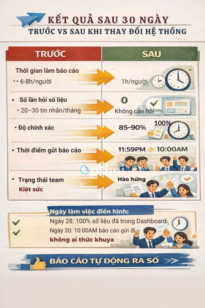 Thay vì “chữa cháy” ở cuối kỳ, agency này quyết định thay đổi cách tổ chức công việc và dữ liệu ngay từ đầu dự án. Trong vòng 30 ngày, họ chuyển từ trạng thái mỗi kỳ báo cáo đều phải gom số, hỏi team, sửa phút chót sang một cách làm mới: báo cáo được hình thành trực tiếp từ tiến độ và dữ liệu đã được cập nhật sẵn.