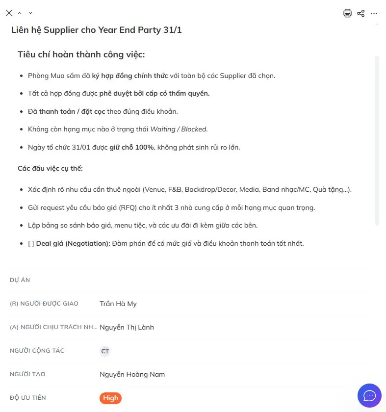 • Tính năng “Tiêu chí hoàn thành” được tích hợp trực tiếp vào từng task. Khi giao việc, người giao buộc phải định nghĩa rõ: